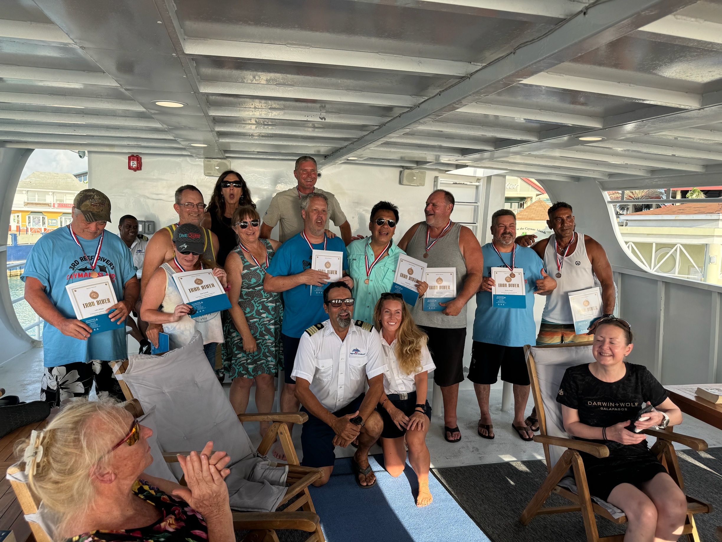 A beautiful last day of diving. We woke up to sunshine and got ready for our first dive at sunset house reef. Danny led the dive as this is his favorite site with the beautiful mermaid. They saw peacock flounders, drum fish, garden eels and had a wonderful time. In between the dives everyone sat down the Sarah for check out, and then got ready for the final dive. We moved the boat to Devil’s Grotto, and Rodel took everyone on a beautifully relaxing dive through all the tarpon filled swim throughs. Back on the boat, everyone rinsed their gear, sat down for lunch, and then made plans for the afternoon. Some went to the Turtle Center, while others shopped and walked around. After a lovely afternoon on land, everyone joined the crew for the farewell wine and cheese party on the sundeck. 11 Iron Diver awards were handed out, in addition to two Advanced Open Water Awards, a Fashion award, and 3 milestone awards for hitting dives 100 and 200th! Thank you all for an amazing week at sea. The crew hope to dive with you all again!!
