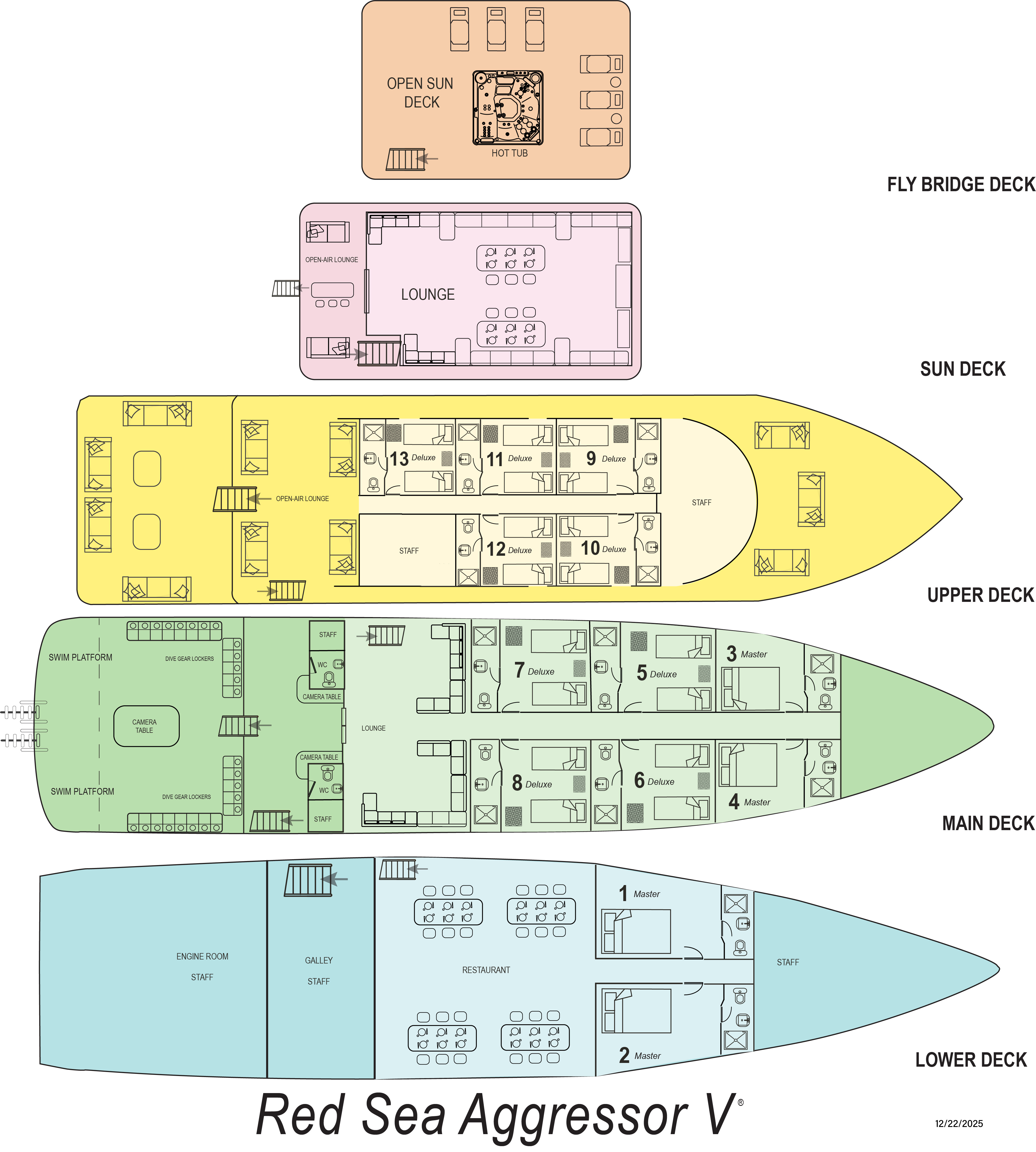 The Red Sea Aggressor V has 4 Master staterooms (#1 - 4) with a queen bed and porthole; 9 Deluxe staterooms, 4 with two single beds that can convert to a king bed (#5 - 8) with 5 & 6 a port hole and 7 & 8 a picture window and 5 staterooms with 2 single beds (#9 - 13) with a picture window. The yacht has a beautiful spacious interior salon with a bar, open-air sun deck, an upper sun deck with a bar and a hot tub. Wifi is available on Fri, Sat and Sun only.