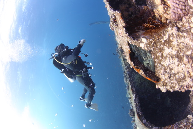 Dive 4 – The Barge. Was located under our boat it made it a perfect first night dive as very easy with a maximum depth of 15m/45ft. Guests saw lots of marine life, large trevallies hunting, scorpion fish, squid, shrimps, George the moray and much more.