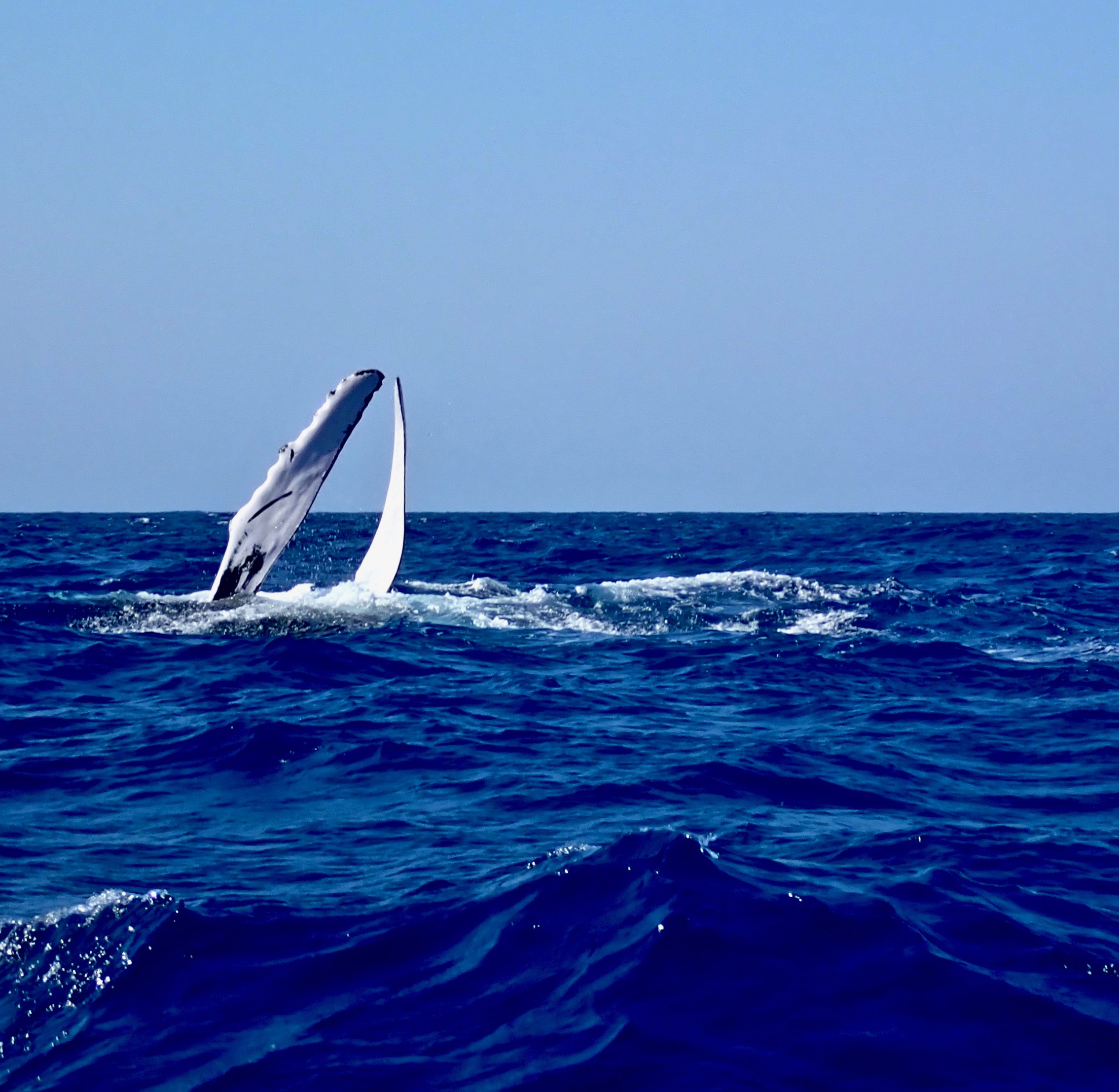 Monday on the Silver Bank was a windy day. However we still enjoyed the Sunshine and Humpback Whale Encounters. In the morning we encountered several pairs of Mothers with Calf. They were teaching the Calf to Breach and also giving the Small One a Workout to build its Endurance for the Long Journey back North to their feeding grounds. Between Mother and Calf encounters we enjoyed Adults Breaching and Peck Slapping. After Lunch we came across a Singer which we enjoyed in-water time for most of the afternoon. Atlantic Humpback whales will all sign the same song and over a years time it will slightly change. After seven years it is a completely different song. When in the water with a Singer you can hear and also feel the vibration through you body core, now that’s magic to the ears. However the day on the water still wasn’t over. Just as we were returning to the Yacht a small pod of Bottlenose Dolphins came by and swam around the Tender and Yacht. They were swimming too fast to get in but it was a Wonderful Show!