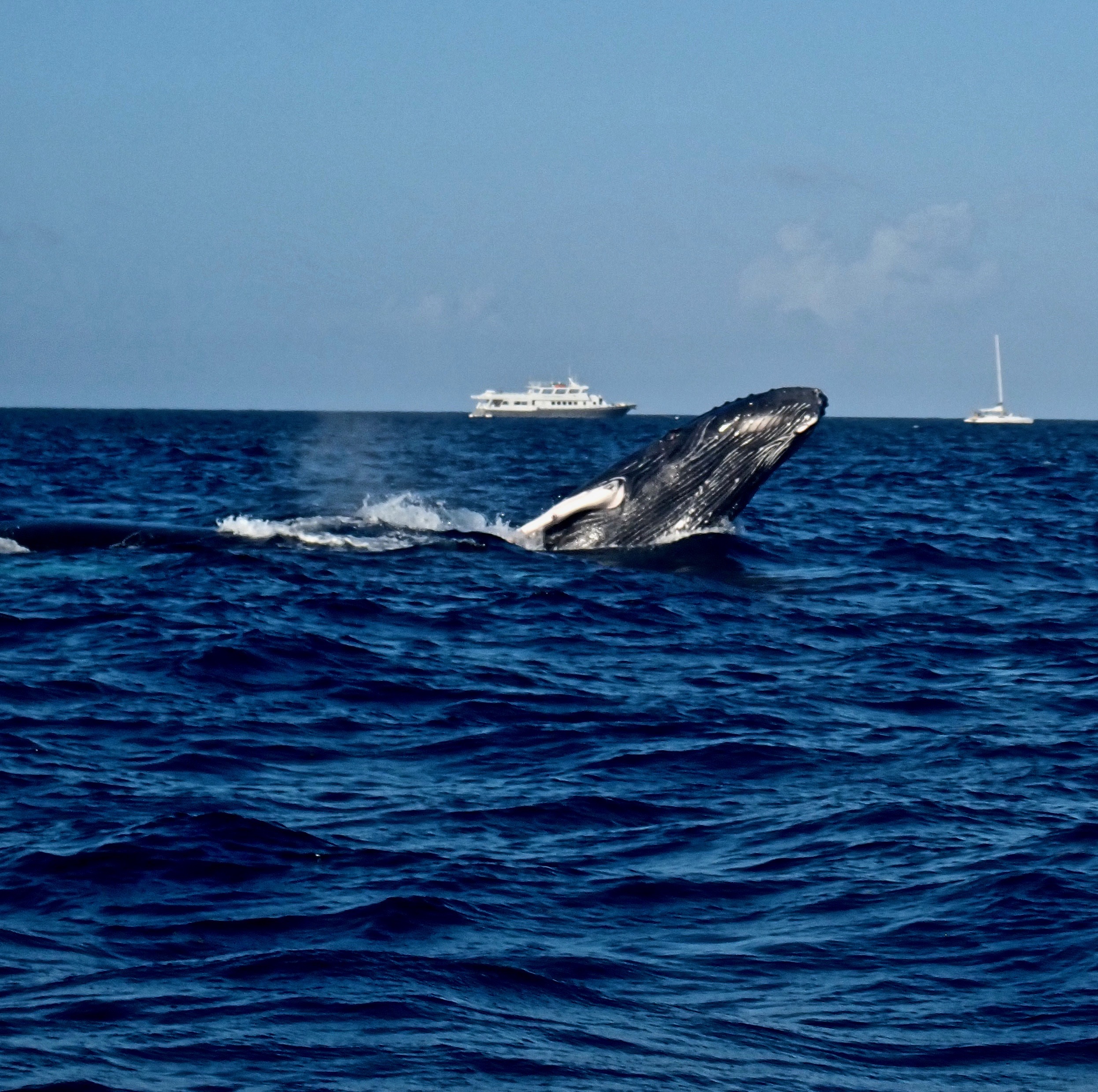 Our final full day on the Silver Bank and we enjoyed some topside and in-water encounters with the Humpback Whales. We were next to Rowdy Groups and Mother and Calves. Adults and Small Calves Breaching, Tail Lobbing, Peck Slapping, Tail Slapping and Mothers working out the Calves to build their endurance. At one point we were working with Mother and Calf, traveling at 4.5 knots in the tender and while traveling at that speed the calf was Breaching and Tail Lobbing. Then it all slowed down and both started Peck Slapping, Mom rolling on her back using both Pecks to slap the water surface. To end the day we had a Wonderful in-water Encounter with a Mother and Calf. Because everyone remain still and in a line both Mother and Calf came by for a close up swim Mom looking a several guest eye to eye. On the way back to the yacht to finish the day we had another set of Mother, Calf and Escort Breach and Breach and Breach. A Nice Show!!