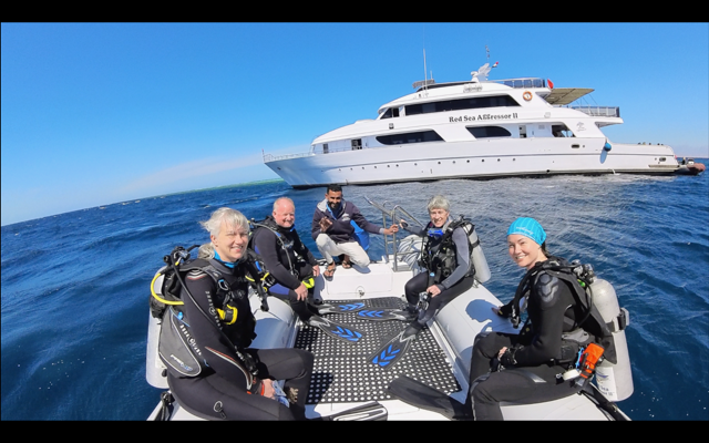 Dive 3 – Ras Umm Sid a short tender ride away close to the shore of Sharm. A great gentle morning dive keeping the reef left all the way slowly drifting around the coral garden and smb and pick up by the big boat. Huge fan corals, beautiful coral formations over the reef and a lot of marine life. Guests saw; tuna, barracuda, jacks, butterfly fish, banner fish, scorpion fish and much more.