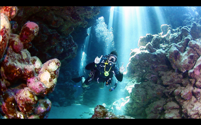 A drift dive. Guests entered from the platform, swam through a small tunnel at 5m/15ft, and explored the main reef.