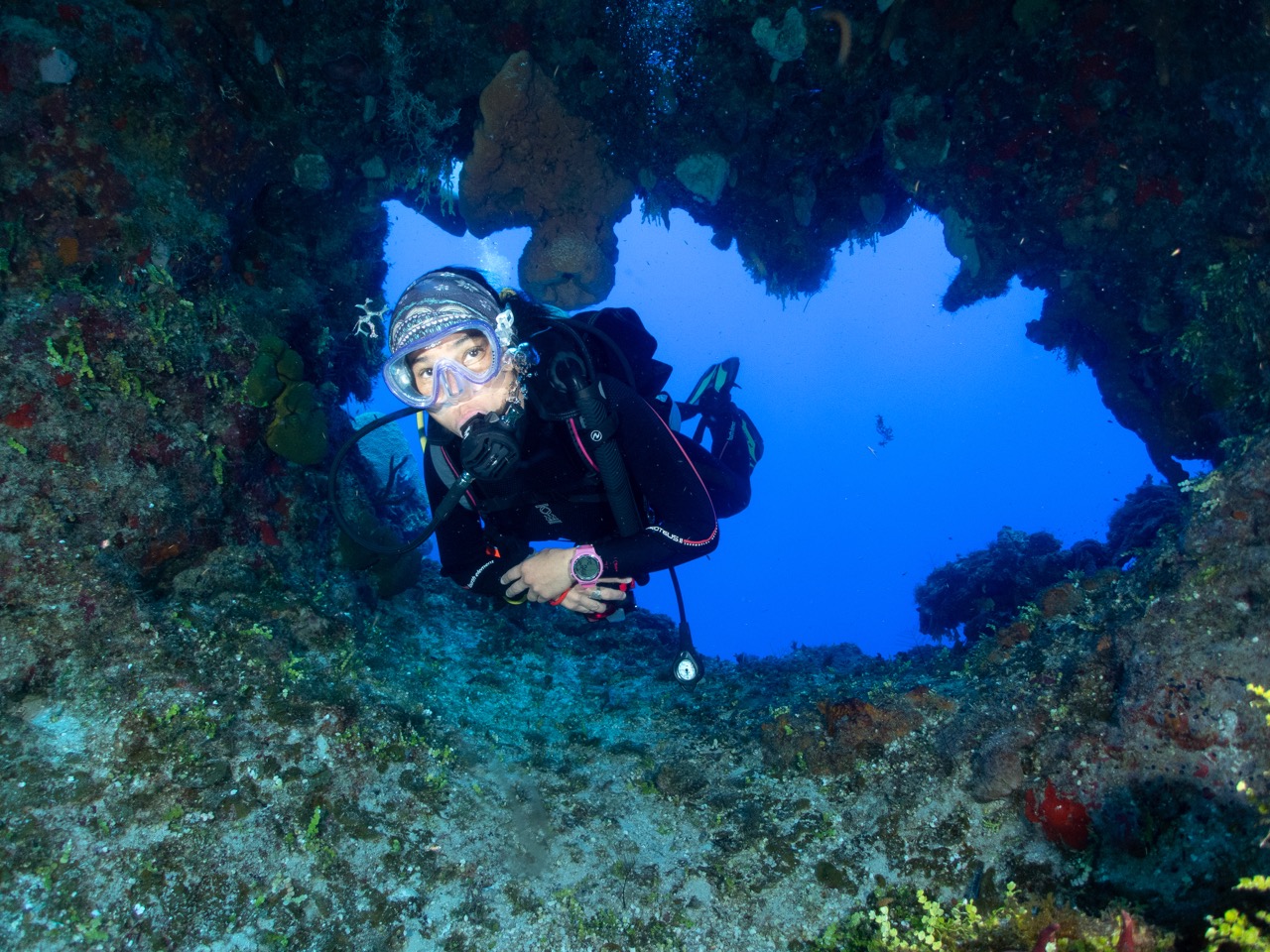 Led by Dive Pro Sarah, the group threaded swim-throughs to the famed Mixing Bowl. Turtles, grunts, and lettuce slugs added charm to the wall dive.