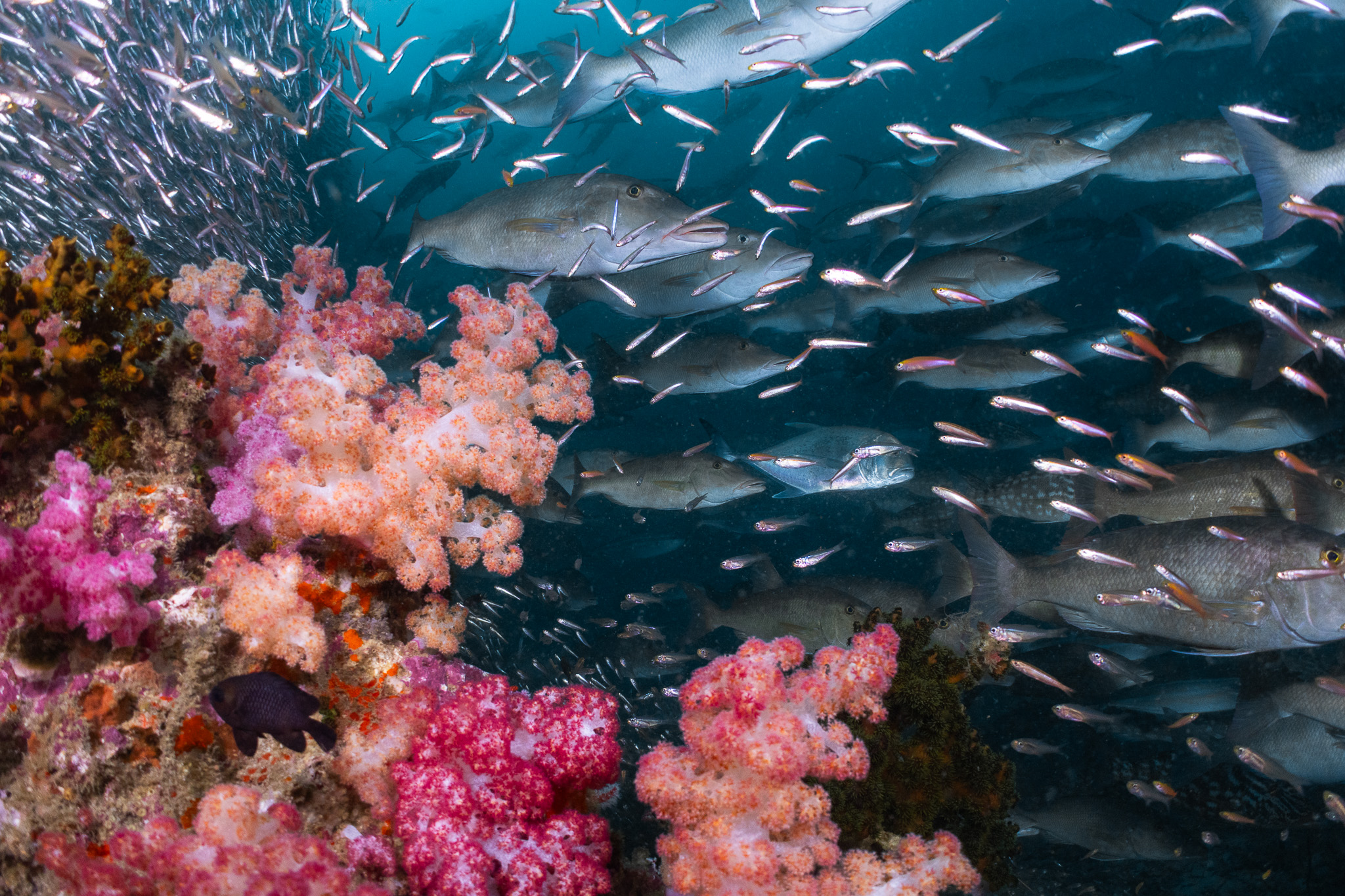 Giant trevally, barracuda, rainbow runner, white-eye moray, vibrant peacock mantis shrimp, scorpionfish, batfish, and millions of tiny fish that blanket the pinnacle in silver motion. A breathtaking spectacle.