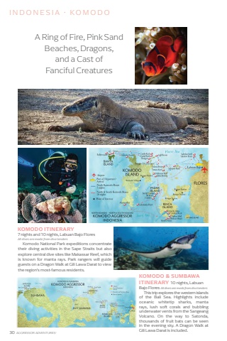 A Ring of Fire, Pink Sand Beaches, Dragons, and a Cast of Fanciful CreaturesKOMODO ITINERARY7 nights and 10 nights, Labuan Bajo FloresAll dives are made from dive tendersKomodo National Park expeditions concentrate their diving activities in the Sape Straits but also explore central dive sites like Makassar Reef, which is known for manta rays. Park rangers will guide guests on a Dragon Walk at Gili Lawa Darat to view the region%u2019s most-famous residents. KOMODO & SUMBAWA ITINERARY 10 nights, Labuan Bajo Flores All dives are made from dive tendersThis trip explores the western islands of the Bali Sea. Highlights include oceanic whitetip sharks, manta rays, lush soft corals and bubbling underwater vents from the Sangeang Volcano. On the way to Satonda, thousands of fruit bats can be seen in the evening sky. A Dragon Walk at Gili Lawa Darat is included. 30 AGGRESSOR ADVENTURES%u00aeINDONESIA %u00b7 KOMODO